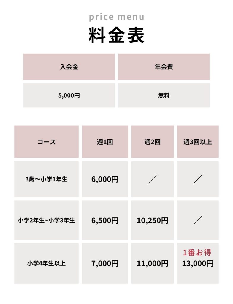 月謝:月3回5,500円(1レッスン追加1,000円)